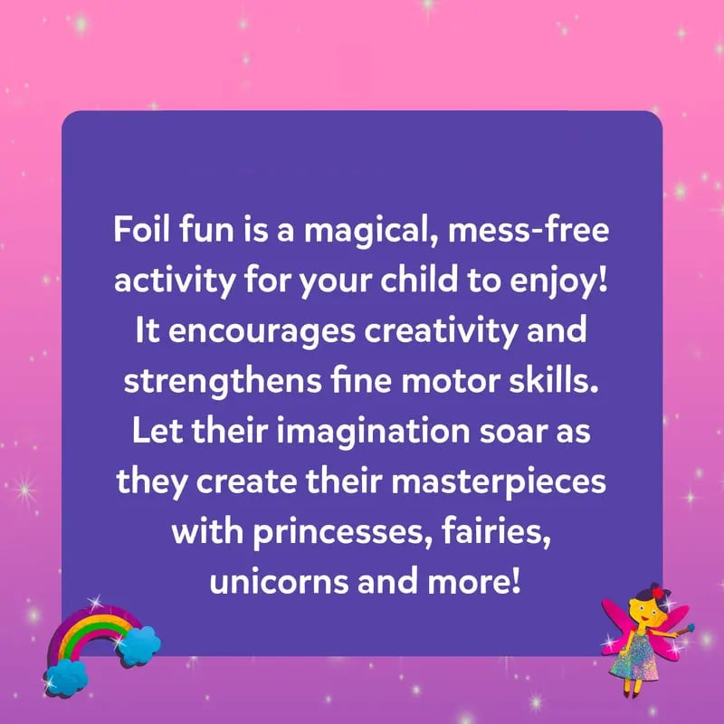 •Foil art & craft activity: Let your child's imagination soar with this magical. mess-free foil art and craft activity. They can create stunning pictures featuring princesses. fairies. and unicorns. sparking hours of creative play!