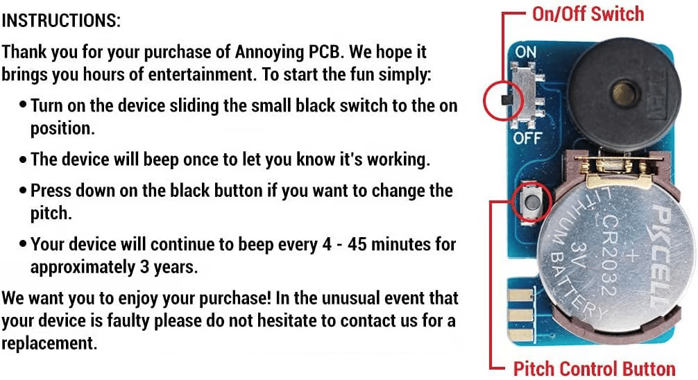 It Includes Multiple Sounds. Cricket Chirp. Beep & More. It is suitable to prank friends. co-workers or partners. especially those who are creeped out or really annoyed by insects.