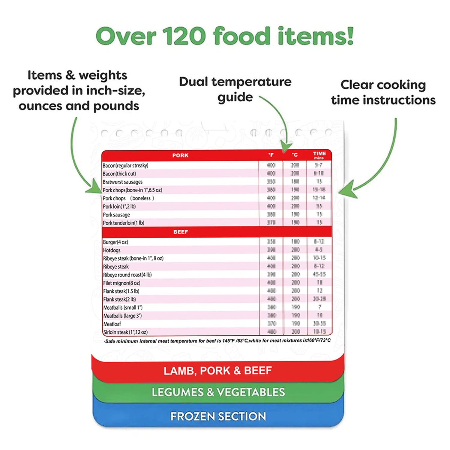 - 📔【Cooking Times Reference Guide】Air fryer cooking times chart magnet. times and temp guide.Special sections include: tips & tricks steak doneness prime rib cook temperature chart. safe minimum internal meat temps. vast Legumes & Vegetables section for vegans and unique Bakery. Desserts & Snacks category