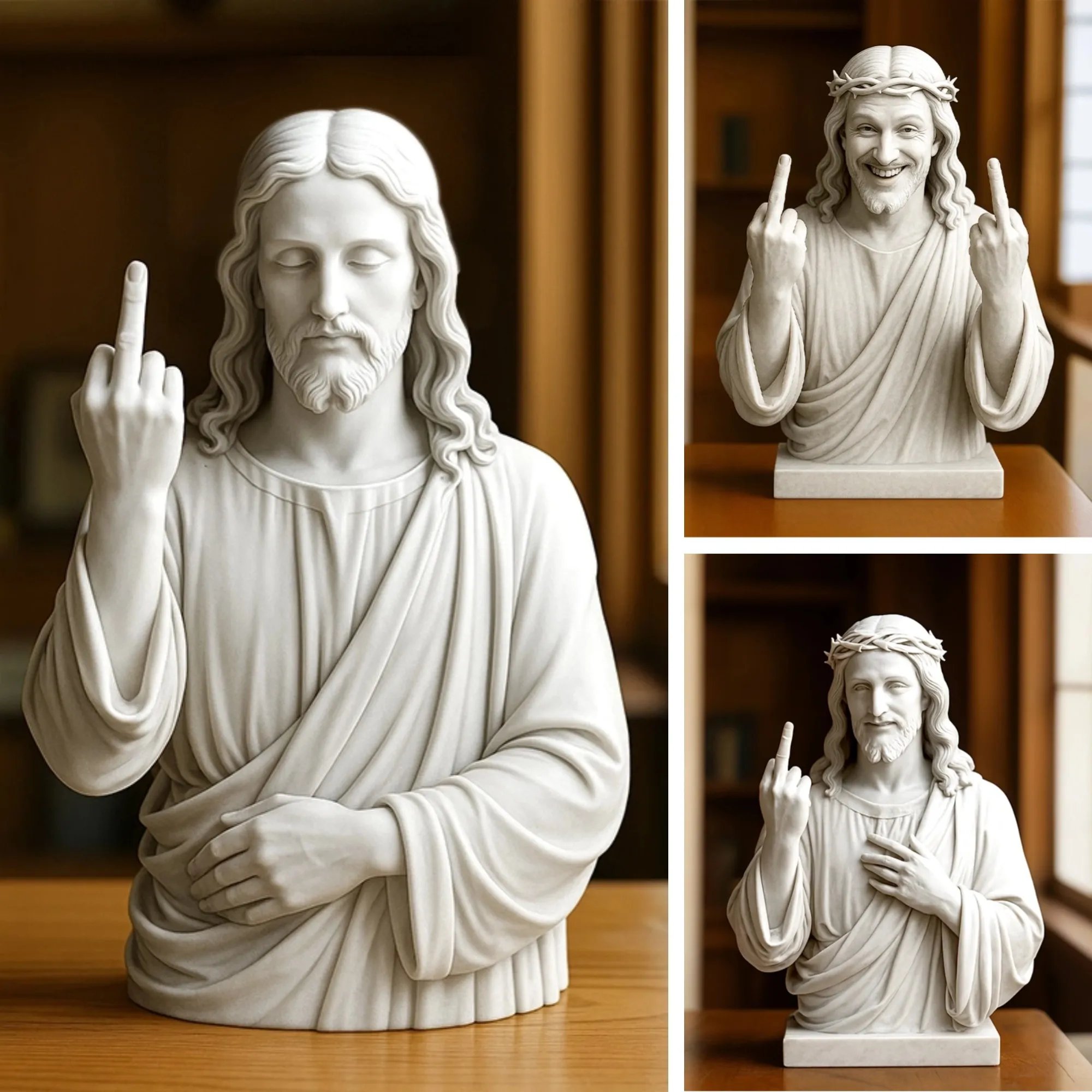 It blends the language of Renaissance sculpture with contemporary satirical aesthetics, molded in one piece with realistic details - from the curls of Jesus' hair to the flowing folds of his holy robes, from the divinity of his brow to the provocative implications of his hand gestures, every angle triggers a new interpretation.