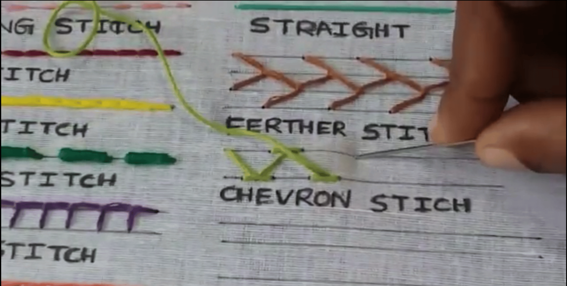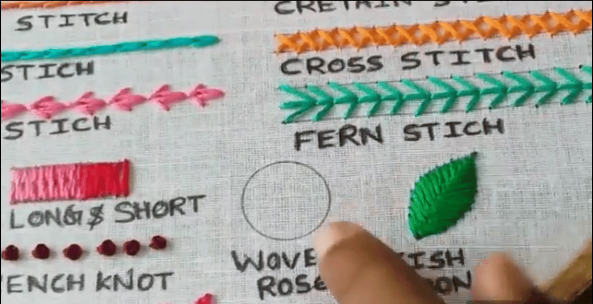 This linen fabric has each embroidery stitch name in English. so you can start stitching under the stitch name.