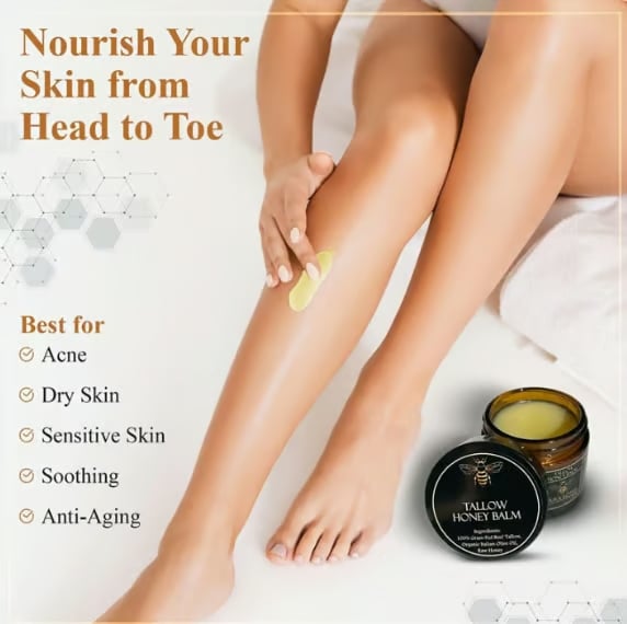 100% Grass-Fed Beef Tallow: it offers intense hydration and supports skin elasticity. resembling skin's natural oils for effective barrier restoration. Organic Raw Honey acts as a humectant. drawing moisture into the skin and promoting exfoliation. Organic Italian Olive Oil provides antioxidant protection against free radicals and premature aging while reducing redness. Organic Beeswax forms a protective barrier. locking in moisture without suffocating the skin.