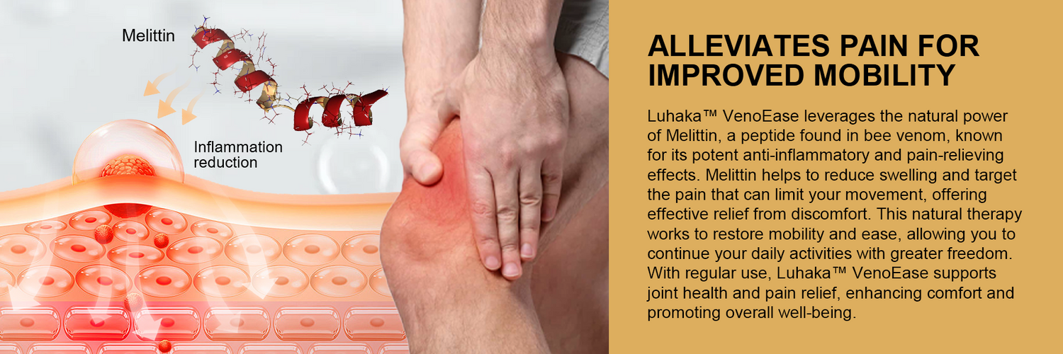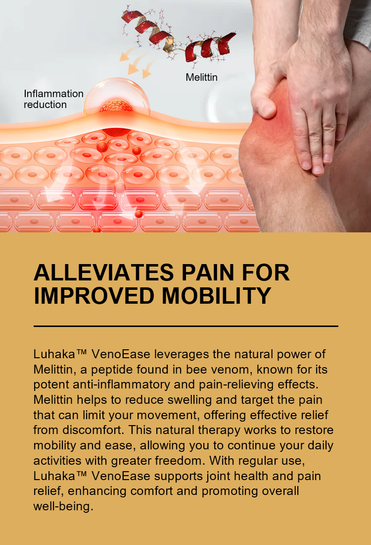 Luhaka™ VenoEase harnesses bee venom's anti-inflammatory power to relieve pain and swelling. This natural formula soothes discomfort, reduces inflammation, and improves mobility, promoting faster recovery and daily comfort.