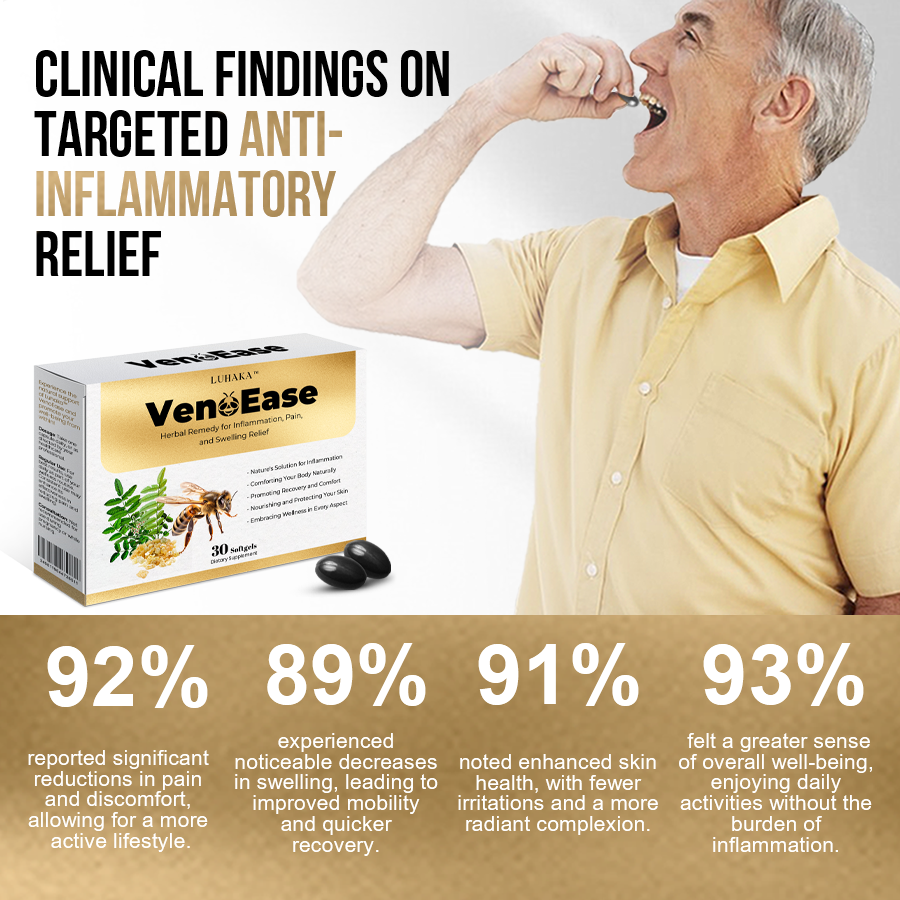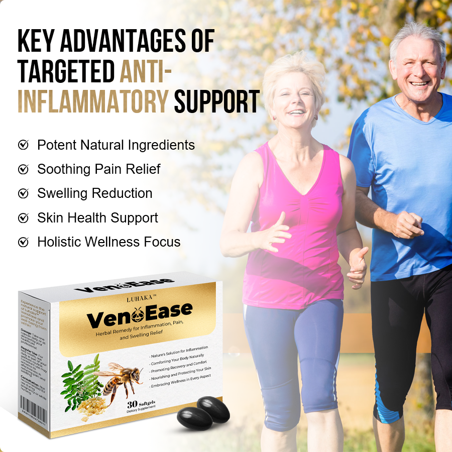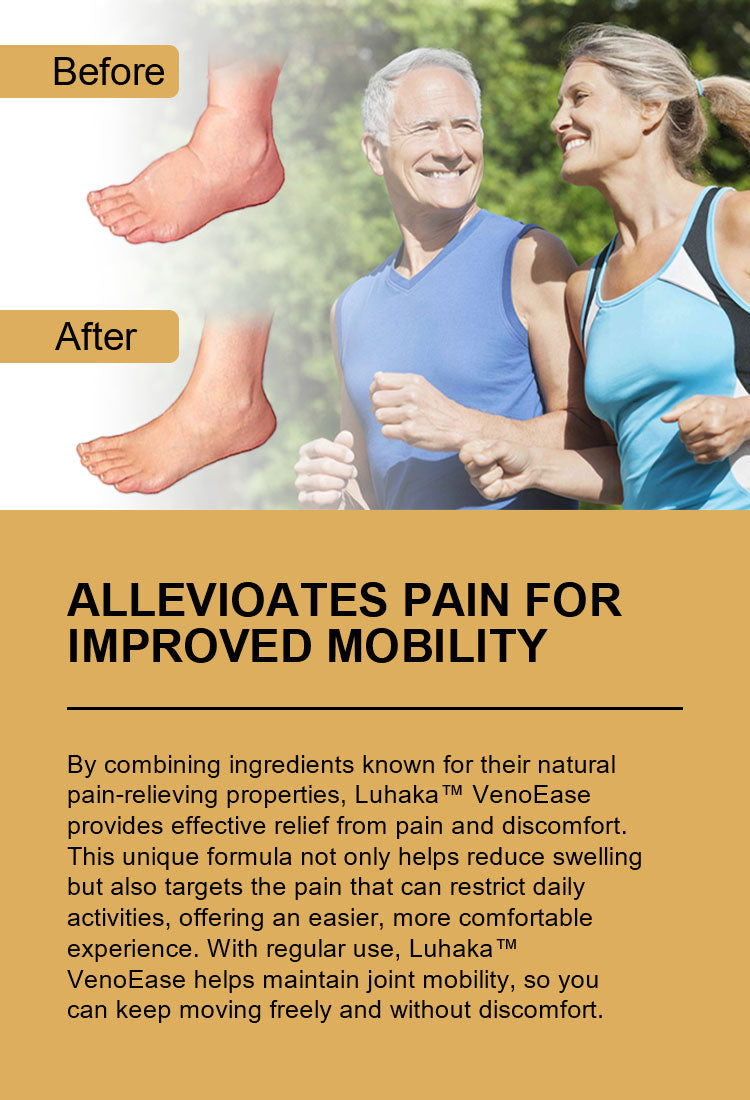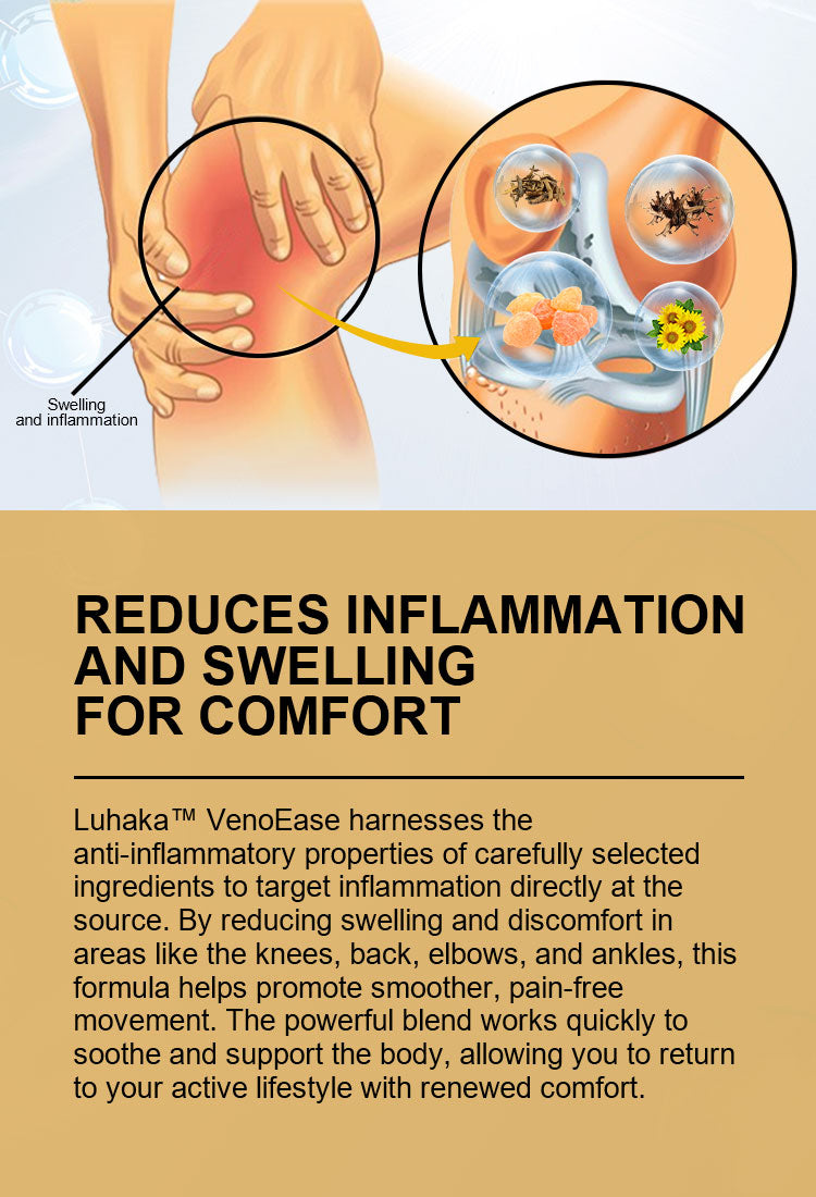 Luhaka™ VenoEase combines anti-inflammatory ingredients that target swelling and pain. It works by improving circulation, soothing inflammation, and enhancing joint flexibility, helping you regain mobility and reduce discomfort.