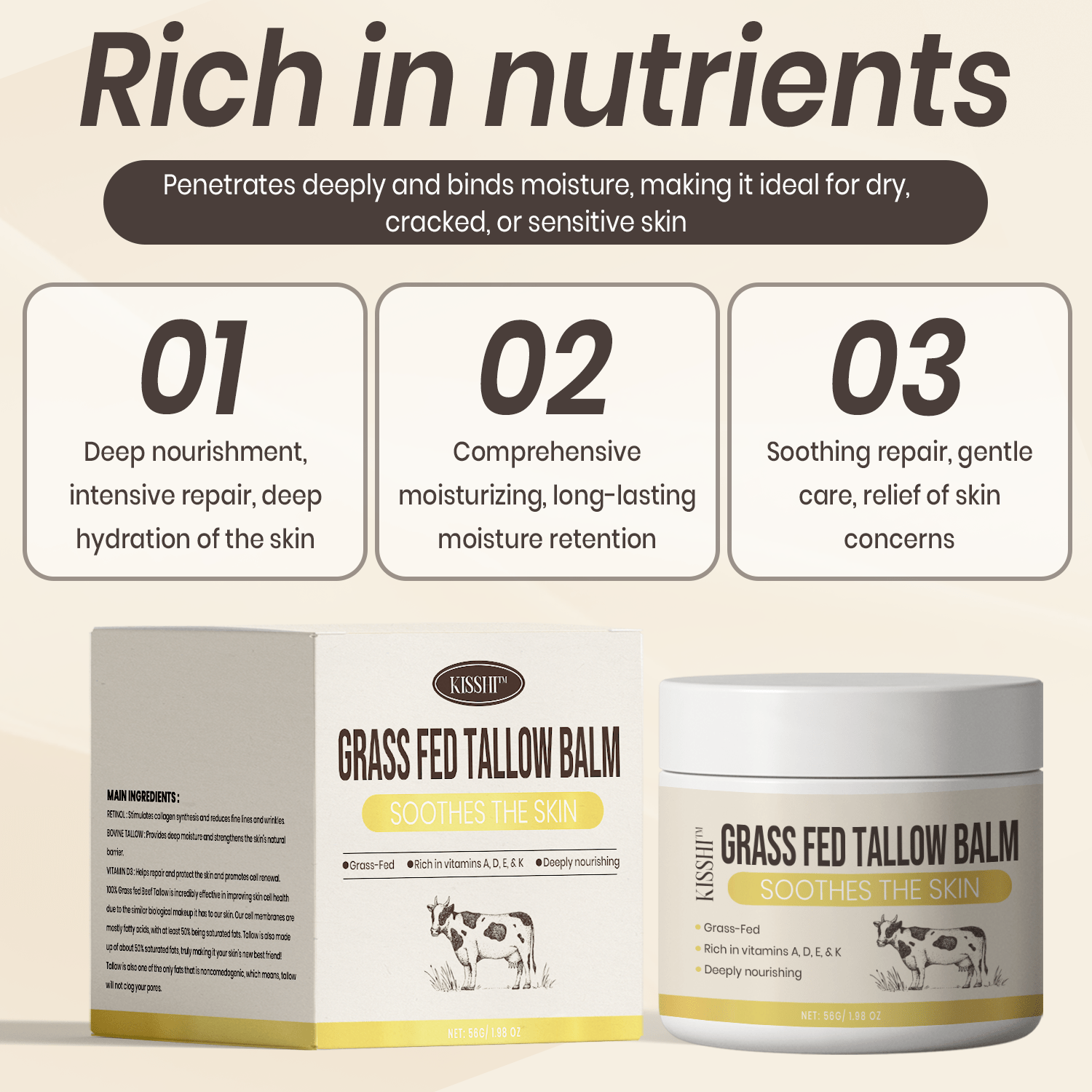 KISSHI™ Grass Fed Tallow Balm uses high-quality ingredients to maximize its benefits by locking in moisture, stimulating collagen production, smoothing wrinkles, and repairing damage.